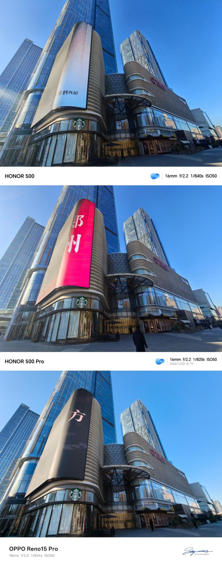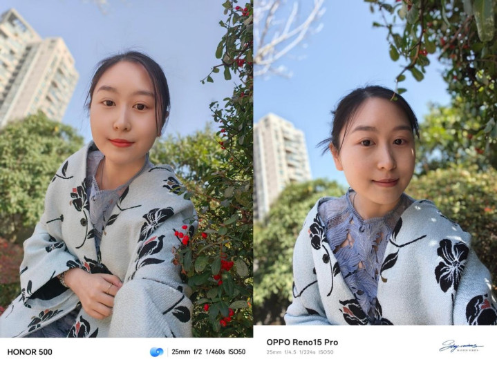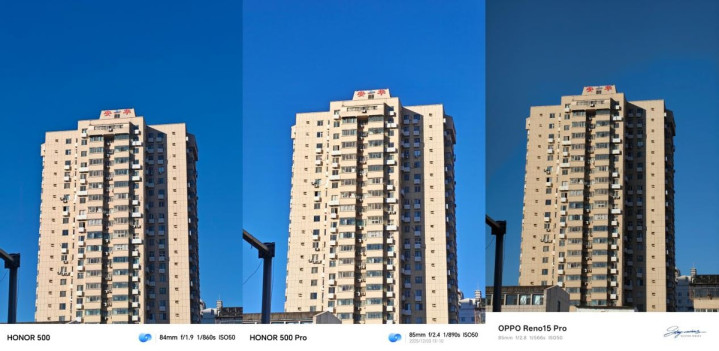 这张图白天的图片可以看出来,Reno 15系列反光过曝表现比较严重,而荣耀500 Pro的表现最好。