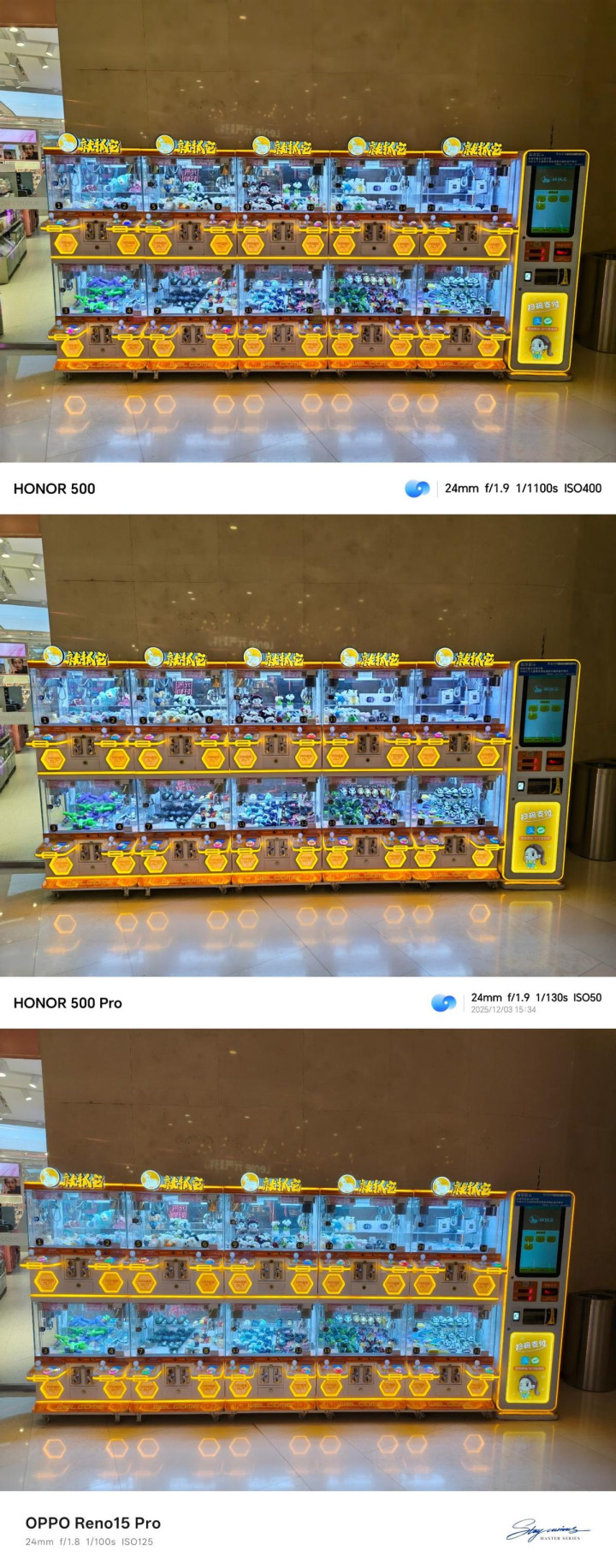 超广角方面,三者差距并不大,虽然Reno 15 Pro的超广角是5000W像素,但默认输出的1200W像素照片拉不开差距。荣耀500系列在商场内部还更显透亮一些。
